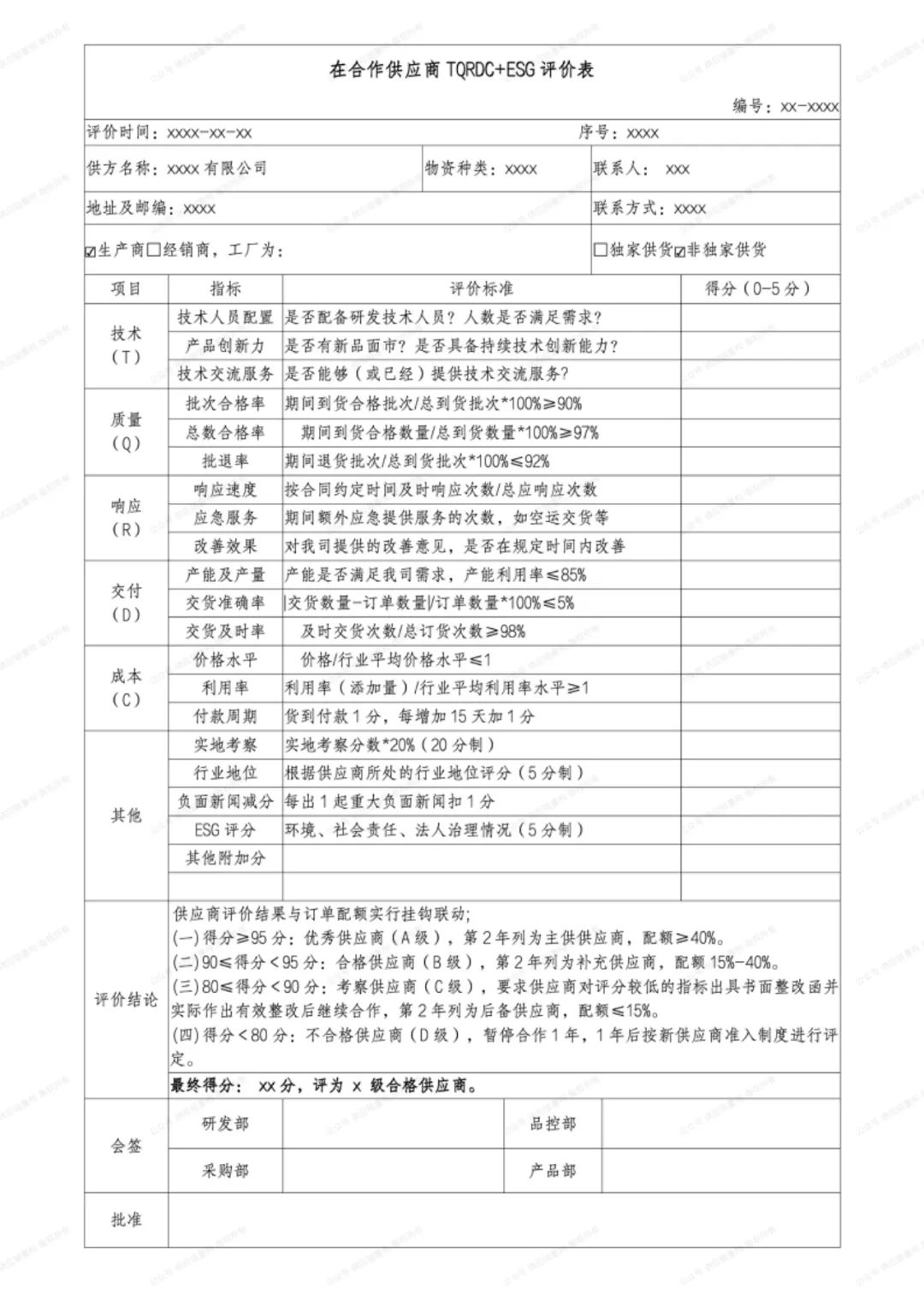 我们曾将供应商评价指标归纳为“T、Q、R、D、C”五个基础指标和“E、S、G”三个附加指标,详见公众号供应链重构文章《供应商评价指标中的T、Q、R、D、C、E、S、G分别是什么?》。这些指标值的提取,涉及采购、质量等部门,必要时还需综合现场考察(验厂)评分。关于现场考察评分表,可大致参考公众号供应链重构文章《供应商现场...