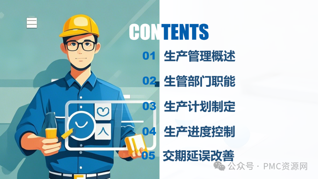 下面为大家分享一份生产计划管理培训PPT模板,该PPT培训模板从生产管理的基础概念,到生管部门的具体职能;从生产计划的制定流程,到生产进度的有效控制,再到交期延误的改善策略,全方位解锁生产计划管理的奥秘,它主要从以下5个方面的内容展开:1、生产管理概述生产型企业通过投入、转换、产出实现资本、价值和素质提升,涉及多个功能...