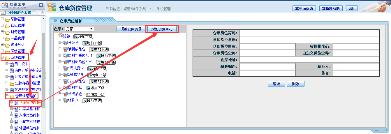 输入仓库名称——点击“确定”完成以上增加运营中心和仓库及货位的方法,如果需要删除新建...
