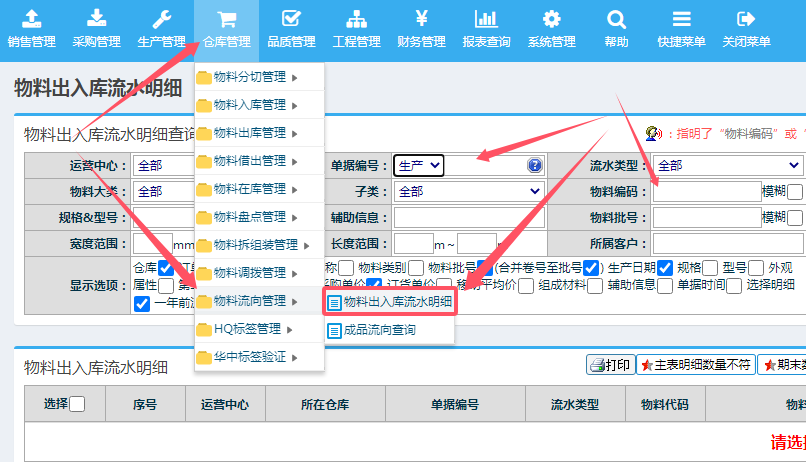 【点晴模切ERP】如何实现以生产工单号查询到对应的物料使用批次,便于查询和追溯物料异常的范围进入仓库管理-》物料流向管理-》物料出入库流水明细中(如果看不到此菜单,则应该向管理员申请开放此菜单访问权限):在物料出入库流水明细查询页面,根据实际需要查询的单据类型,选择单据编号中的类型为:销售/采购/生产,然后输入销售单/...