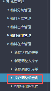 进入ERP系统之后,在左侧的功能菜单里找到“仓库管理”,点开“物料在库管理”,点击“库存调整单查询”。