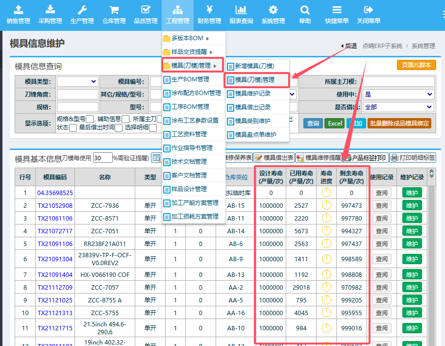 【点晴模切ERP】请问模具寿命统计在哪里可以查询到?在工程管理-》模具(刀模)管理-》模具(刀模)管理中,可以看到各个刀模的使用情况统计: