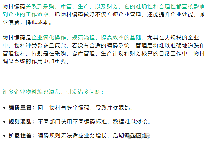 如何进行物料编码?前面,我们讲到物料的ABC分类,是从物料对成本的影响权重维度进行分类。而为了更好地管理物料,同时也是信息化的基石,我们还必须对物料进行合理、科学地编码,物料编码应遵循以下原则:一、唯一性原则物料编码相当于人的身份证号码,即一种物料只能有一个编码,同一个编码,只能对应一种物资,二者必须是一一对应关系。同...