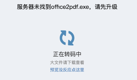 网盘在线预览Office文件时显示正在转码中,然后提示错误:服务器未找到office2pdf.exe,请先升级,已经是最新版了,如何解决?提示很清楚,就是在线预览Office文档需要用到的转码程序office2pdf.exe丢失了,出现这个问题的原因是此文件被点晴MIS服务器上的安全软件拦截或者删除了。解决方法:第1...