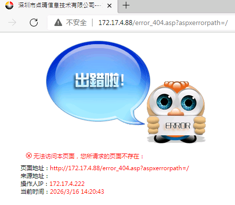 访问点晴OA系统提示错误:无法访问本页面,您所请求的页面不存在,页面地址:error_404.asp