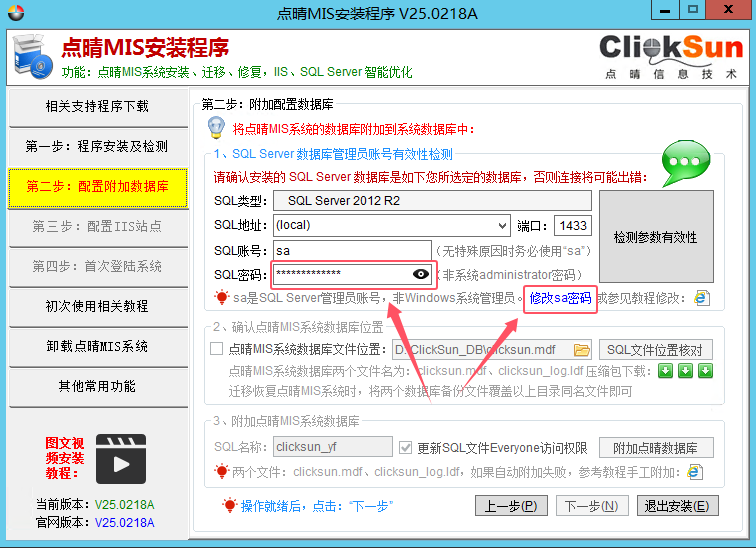管理员更改了SQLServer数据库sa的密码,请问点晴OA中要在哪些位置做相应更改?方法一、采用全自动修改方法(应该用本方法)下载点晴MIS系统安装程序(http://install.oa22.cn),重新安装点晴MIS系统(不需要卸载现有点晴MIS系统),安装过程中提供了修改SQLServer的功能,可以强制更改S...
